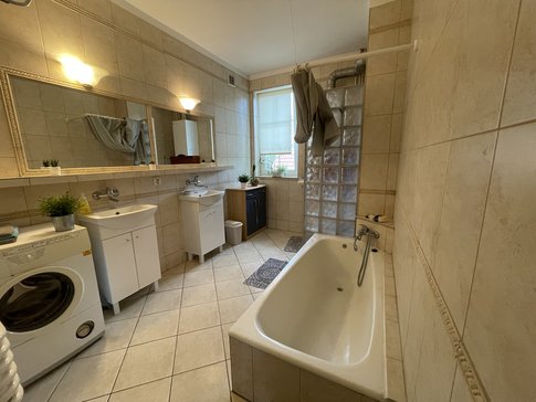 Łazienka - wyposażona w wannę, dwie umywalki, pralkę, wc.